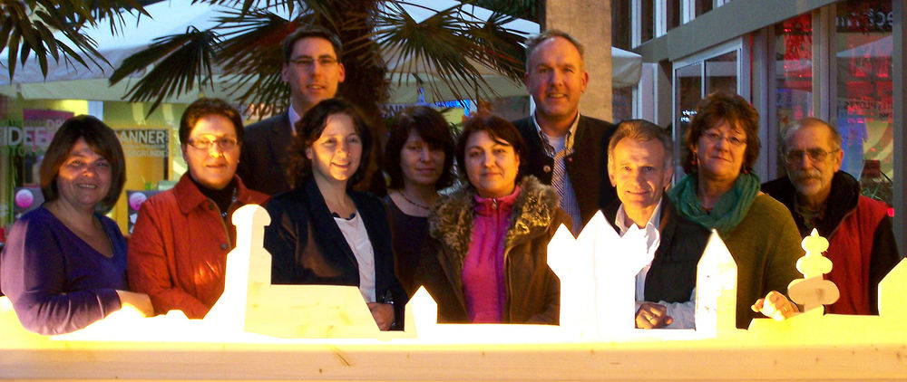 Bildunterschrift: Hinter der leuchtenden Silhouette der Stadt Straubing: u.a. SPD- Ortsvorsitzende Petra Penzkofer Hagenauer (li), Dr. Olaf Sommerfeld (3.v.li.), MdL Ruth Müller (4.v.li.), Stadtrat Peter Stranninger (4.v.re.), Quartiersmanager Edurad Neuberger (3.v.re.), Stadträtin Gertraud Gruber 82.v.re.) und Hans Braun (re.)