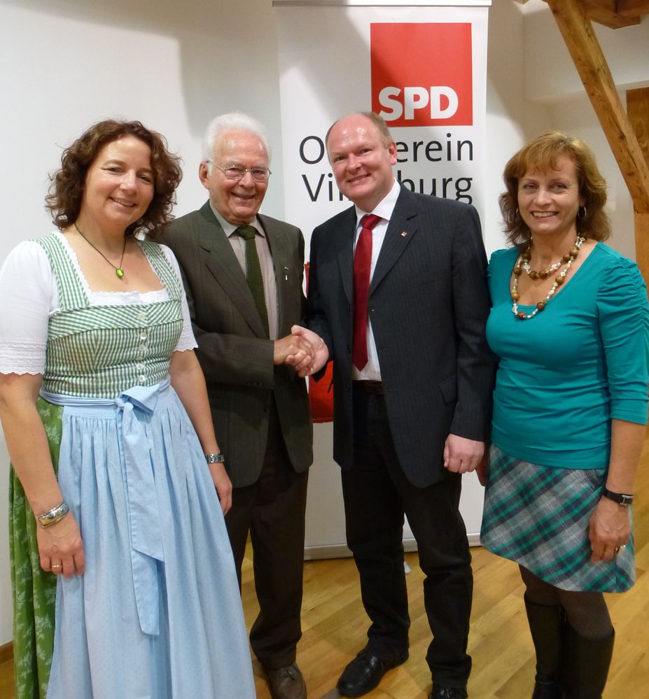 Bildunterschrift: Würdigten die langjährigen Verdienste Josef Billingers (2.v.li) um die Stadt Vilsbiburg und die SPD im Oberen Vilstal: (v.li.) Ruth Müller MdL, Dr. Bernd Vilsmeier und SPD-Ortsvorsitzende Theresa Bergwinkl.
