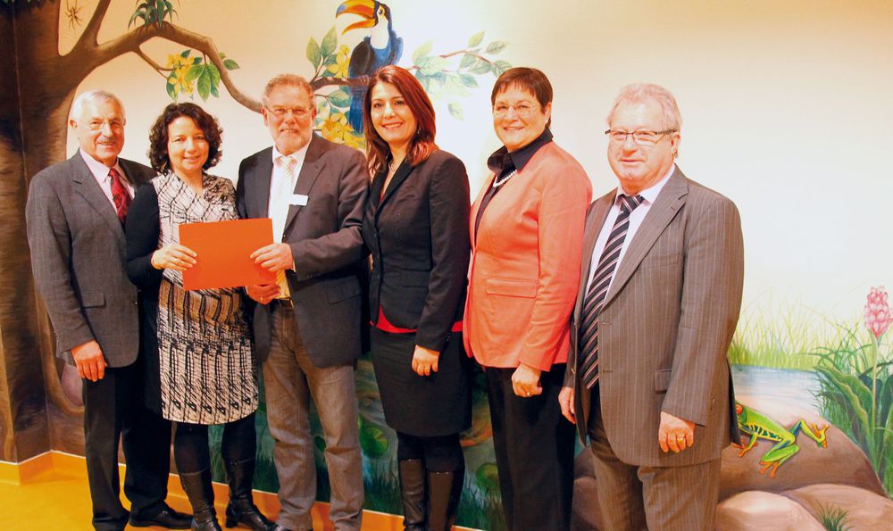 Bildunterschrift: Kreisrat Gerhard Babl, Ruth Müller, MdL; Geschäftsführer Bernhard Brand, Kreisrätin Filiz Cetin, stv. Landrätin Christel Engelhard und Kreisrat Hans Sarcher bei der Spendenübergabe im Kinderkrankenhaus St. Marien