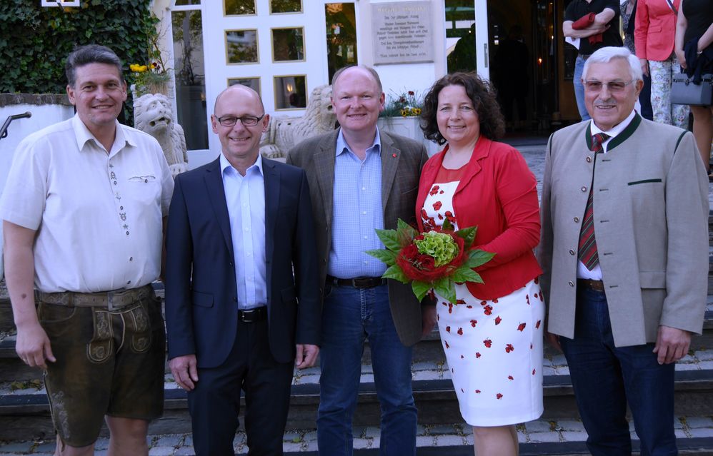 Bildunterschrift: SPD-Kreisvorsitzender Dr. Bernd Vilsmeier gratulierte der Landshuter SPD-Kreisvorsitzenden Ruth Müller MdL und ihren Stellvertretern zur Wahl: (v.l.) Peter Forstner (1. Bürgermeister Neufahrn i. Ndb.), Sebastian Hutzenthaler (2. Bürgermeister Ergoldsbach), Dr. Bernd Vilsmeier, Ruth Müller MdL und Gerhard Babl (Altbürgermeister Velden/Vils).