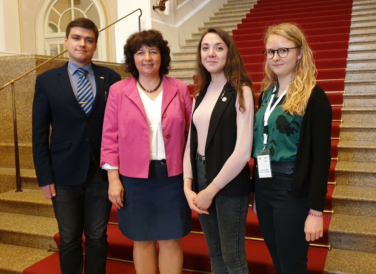 Vor kurzem hatten zwei russische Studenten aus dem Freundeskreis Landshut-Nowosibirsk e. V die Möglichkeit, den Arbeitsalltag einer Abgeordneten im Bayerischen Landtag hautnah kennenzulernen. Nach einem Mittagessen in der Landtagsgaststätte erhielten sie zahlreiche Informationen zu den geschichtsträchtigen Räumen, der Historie und den aktuellen Abläufen im Maximilianeum durch eine Führung, sowie einen Informationsfilm. Im Anschluss stellte Ruth Müller, MdL, die im Landwirtschafts- und Umweltausschuss tätig ist, die Schwerpunkte ihrer Arbeit und eine typische Sitzungswoche mit den genauen parlamentarischen Abläufen vor, angefangen von den erlaubten Redezeiten, dem Procedere der Antragsstellung sowie der zeitlichen Abfolge der oft bis in die Nacht dauernden Vollversammlungen.