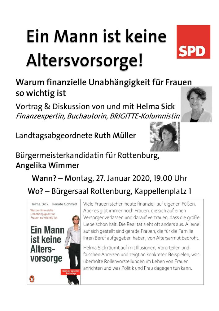 Am Montag, den 27. Januar um 19.00 Uhr erklärt Helma Sick auf Einladung der Landtagsabgeordneten Ruth Müller und des SPD-Ortsvereins Rottenburg im Bürgersaal in Rottenburg, warum ein Mann keine Altersvorsorge ist und wie sich Frauen um ihre finanzielle Unabhängigkeit kümmern können.