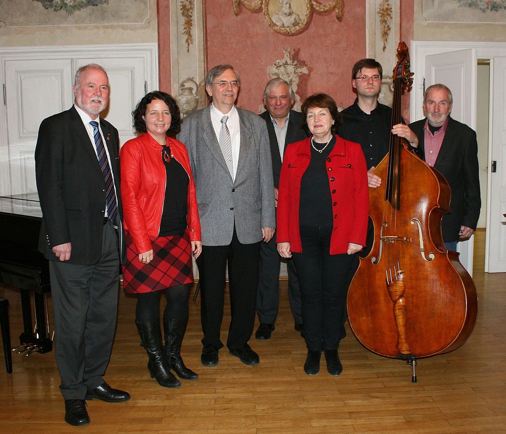 Sie regten durch Worte, die zurückblicken ließen und durch die Musik zum Nachdenken an: (v.l.) Der Vizepräsident des Bundes für Vertriebene Albrecht Schläger, Schirmherrin und Landtagsabgeordnete Ruth Müller (SPD), Pfarrer Peter Nauhauser, Heinz Schönfelder am Flügel, Dr. Marlis Flieser-Hartl Vorstandsvorsitzende von Lakumed, Michael Schönfelder am Kontrabass und Heimatforscher Franz Gumplinger. (Fotos: rg)