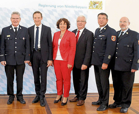 Bild (von links): Bernhard Gruber, Regierungspräsident Rainer Haselbeck, MdL Ruth Müller, Bogens Bürgermeister Franz Schedlbauer, Kreisbrandrat Albert Uttendorfer und Dieter Schlegl, Vorsitzender des Bezirksfeuerwehrverbands Niederbayern. (Foto: Regierung von Niederbayern)