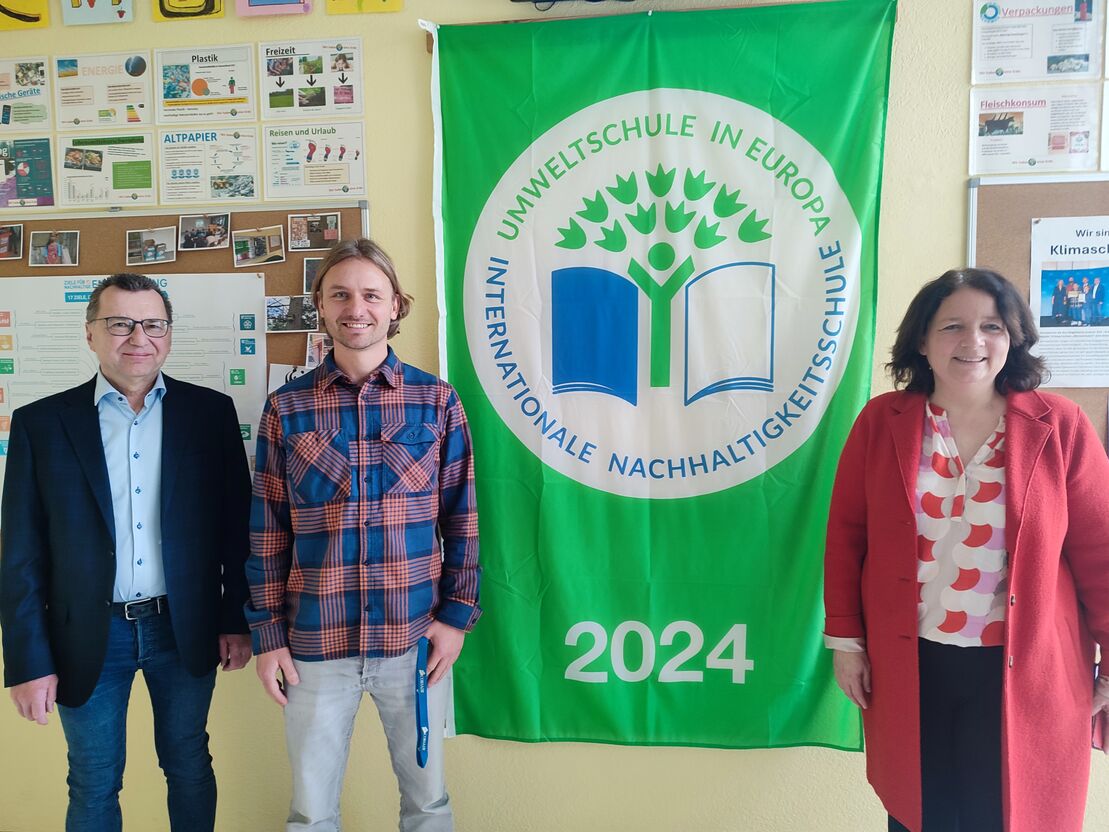 Schulleiter Hermann Schneider, Umweltbeauftragter Simon Bauer und Ruth Müller, MdL