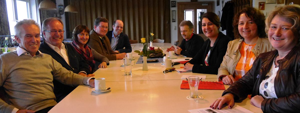 Bildunterschrift: Im Gespräch mit Essenbachs Bürgermeister Dieter Neubauer (li.) und den Marktgemeinderäten und Fraktionssprecher: v.re. Rita Hagl-Kehl, MdB, Ruth Müller, MdL, Kreisrätin Filiz Cetin und SPD-Ortsvorsitzender Martin Huijber.
