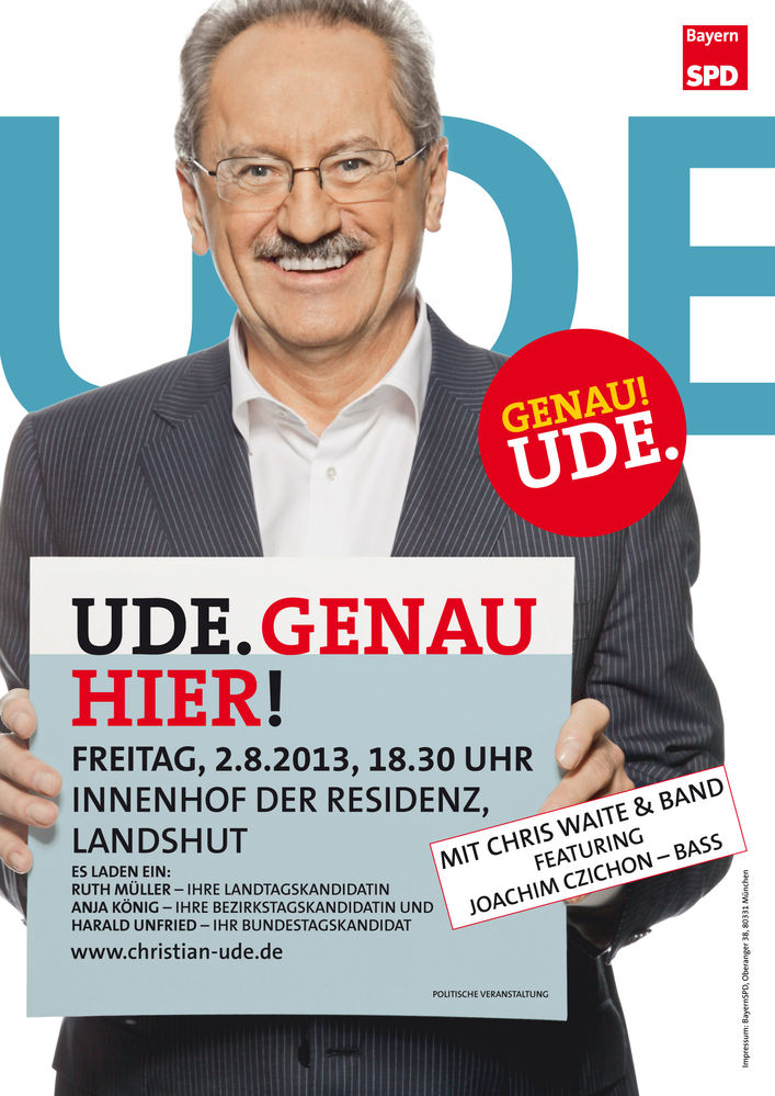 Der SPD in der Region Landshut mit Landtagskandidatin Ruth Müller, Bundestagskandidat Harald Unfried und Bezirkstagskandidatin Anja König ist es gelungen, Christian Ude zu einem Nachholtermin nach Landshut zu holen. Ursprünglich wollte Ude am ersten Landshuter Hochzeitssonntag dabei sein, musste aber wegen der heiklen Situation der Asylbewerber am Münchner Rindermarkt seinen Besuch absagen. Eine laue Sommernacht und ein heißer Wahlauftakt erwartet die Besucher der Residenz am Freitag abend ab 18.30 Uhr. Für die musikalische Umrahmung sorgt die bekannte Band von Chris Waite.