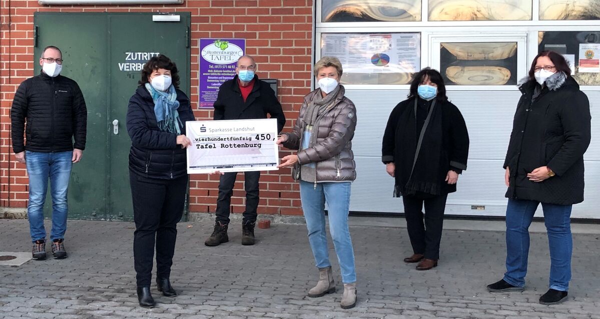 Seit dem Jahr 2012 ist ein Besuch in der Adventszeit bei der Rottenburger Tafel für die SPD-Gemeinderäte aus Rottenburg, Pfeffenhausen und Hohenthann schon Tradition: Denn die beiden Stadträte Franz Gumplinger und Angelika Wimmer aus Rottenburg spenden zusammen mit den Pfeffenhausener Gemeinderäten Thomas Niederreiter und Ruth Müller und der Hohenthanner SPD-Gemeinderätin Christine Erbinger einen Teil ihres Sitzungsgeldes für die Tafel und konnten an die Leiterin Gerti Weinzierl in diesem Jahr 450 Euro überreichen – in diesem Jahr wegen der Abstands- und Hygiene-Regeln nur bei einem kurzen Treffen und im Freien. Draußen müssen im Übrigen auch die Kunden derzeit anstehen, da nur noch jeweils 2 Personen in die Tafelausgabe hineindürfen.
