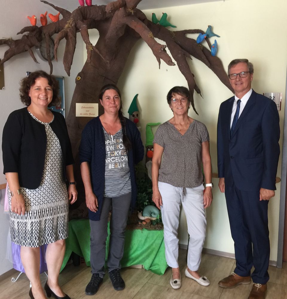 Über 80 Prozent der Bewohner des BRK-Seniorenheims Geisenhausen sind an Demenz erkrankt, oft erst im Anfangsstadium. Doch die Demenzerkrankungen nehmen aufgrund der höheren Lebenserwartung bei Männern und Frauen in den Pflegeheimen zu, machte Pflegedienstleiterin Simone Wackerbauer beim Besuch der SPD-Landtagsabgeordneten Ruth Müller zusammen mit Geisenhausens 2. Bürgermeister Siegfried Kaschel deutlich. Gemeinsam mit Ursula Hubauer, die für das Aufnahmemanagement zuständig ist, stellten sie das Seniorenheim vor, das im Januar 2008 eröffnet wurde und 110 Bewohnern Platz bietet und rund 90 Beschäftigte hat. Viele der Bewohner des ehemaligen Seniorenheims in der Lochhamerstraße seien damals in das neue Haus in der Bahnhofstraße umgezogen. „Zur Zeit haben wir sieben Auszubildende und ab September beginnt ein junger Afghane in Zusammenarbeit mit der bfs gGmbH Landshut sein Praktikum im Rahmen der Ausbildung zum Altenpflegehelfer in unserem Haus“, berichtete Simone Wackerbauer. Auf jeder Station gebe es schon jetzt eine gerontopsychiatrische Fachkraft. Wichtig sei vor allem die Biographie-Arbeit, gerade bei der Kriegsgeneration komme es durch unverarbeitete traumatische Flucht- und Gewalterfahrungen in jungen Jahren immer wieder zu unschönen Erinnerungen. „Uns hilft es viel, wenn die Kinder oder der Ehepartner möglichst viel über das Leben unseres Bewohners wissen, damit man Situationen besser einschätzen kann“, erläuterte Ursula Hubauer die Wichtigkeit der Biographiearbeit. Gerade Bewohner mit Demenz stellen einen großen Betreuungsaufwand dar, der zwar im neuen Pflegestärkungsgesetz berücksichtigt werde, aber nach Meinung der Experten noch nicht ausreichend genug, um genügend Zeit für die demenziell Erkrankten zu haben. Ein besonderes Leuchten in den Augen zaubern die Besuche der Kinder des St.-Martin-Kindergartens hervor, der regelmäßig kommt. Neben wiederkehrenden Angeboten gibt es auch Aktionen im Jahreslauf: Bei Faschingsfeiern, Sommerfesten und dem Volksfestbesuch trifft auch 2. Bürgermeister Siegfried Kaschel viele der Bewohner immer wieder.