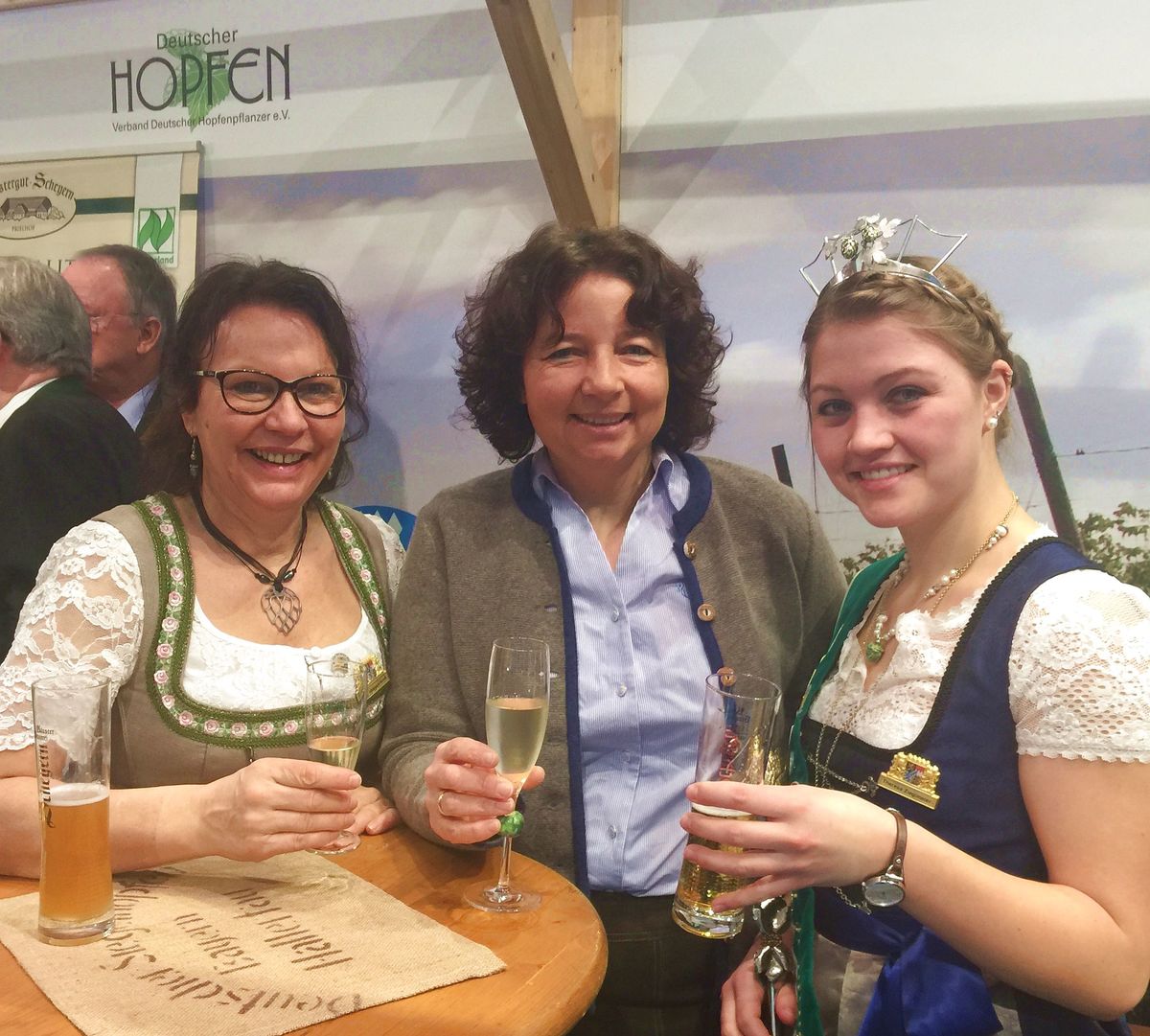 Die Bekanntheit des Hopfenanbaugebiets Hallertau erstreckt sich weit über die Grenzen Niederbayerns. Umso mehr freute sich die Landtagsabgeordnete Ruth Müller, die aktuell mit dem Ausschuss Landwirtschaft und Forsten des Bayerischen Landtages auf der Grünen Woche in Berlin zu Gast ist, auf die Hallertauer Hopfenkönigin Theresa Zieglmeier zu treffen. Gemeinsam genehmigten sich die beiden Pfeffenhausenerinnen den „Hopfensecco“ von Hildegard Haindl, die mit ihrer Holled`Auer Doldenschänke erfrischende Getränke aus der Hallertau in Berlin vorstellt und damit beweist, dass Niederbayern in Sachen Innovation und Kreativität ganz vorne mit dabei ist.