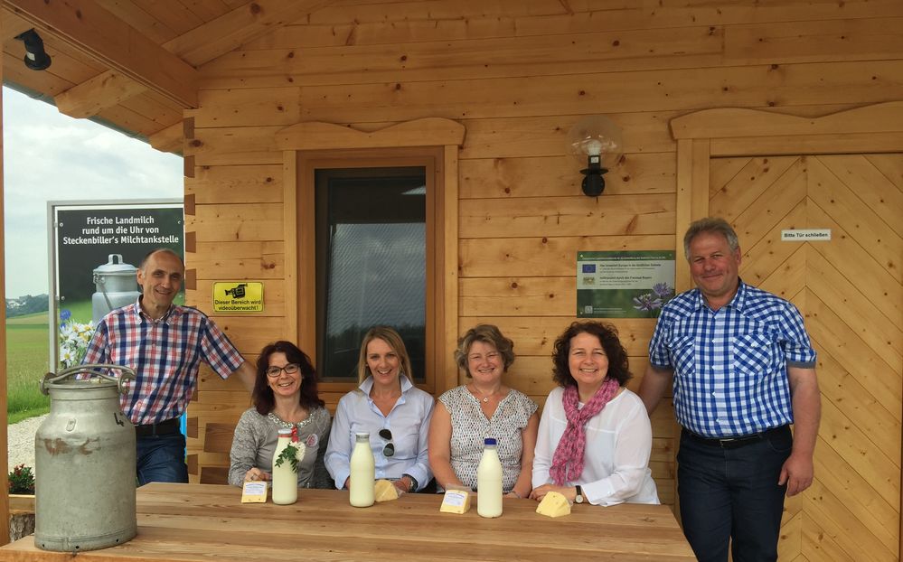 Nur wenige hundert Meter ist die B299 und die JVA Landshut vom idyllischen Hof der Familie Steckenbiller im Salzdorfer Tal entfernt. „Verkehrstechnisch liegen wir also günstig, sowohl für die Autofahrer als auch für die Spaziergänger, die aus Achdorf und Kumhausen auf unseren Hof kommen“, erläutert Georg Steckenbiller das Verkaufskonzepts seiner „Milch- und Käsetankstelle“. Die beiden Landwirtschaftspolitikerinnen Rita Hagl-Kehl (MdB) und Ruth Müller (MdL) waren zusammen mit den beiden Vorsitzenden der SPD Landshut, Anja König und Patricia Steinberger zu einem Besuch auf den Milchviehbetrieb gekommen.