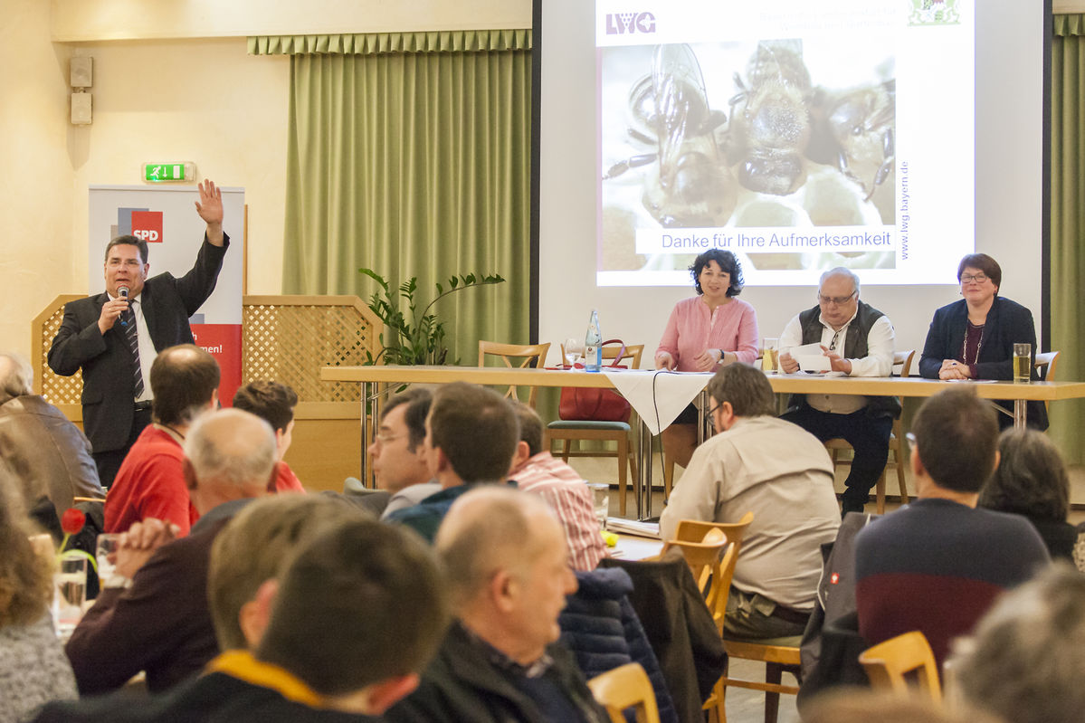 Zum Ende des Themenabends im Landgasthof Stark gingen Dr. Illies, Rainer Holzapfel, Ruth Müller und Herbert Woerlein noch einmal auf Fragen zur finanziellen Förderung der Imkerei in Bayern ein. Unter anderem verursachen Ausgaben für Varroabekämpfungsmittel und immer häufiger auftretende Spätfröste hohe wirtschaftliche Einbußen für die Imker. Holzapfel: „Ein finanzieller Ausgleich kann zwar einiges mildern. Aber er kann für die Bienen keine Apfelbaumblüte ersetzen.“