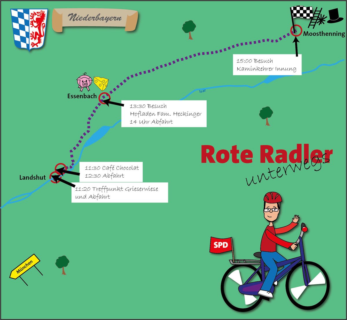 Alle Mit-Radler treffen sich auf der Grieserwiese zur Abfahrt um 11.20 Uhr Richtung Landshuter Altstadt. Die Tour beginnt mit einem Informationsgespräch im Café Chocolat, Altstadt 254, bei dem aktuelle politische Themen erörtert werden sollen. Weiter geht es um 12.30 Uhr Richtung Essenbach auf einer 13 Kilometer langen Strecke zum Hofladen der Familie Heckinger, Mittelstr. 8, um gegen 13.30 Uhr Näheres zur Direktvermarktung in Niederbayern zu erfahren – sofern die Zeit es erlaubt wird außerdem das Schweinehotel besichtigt. Um 14 Uhr wird weitergeradelt bis zur Kaminkehrer-Innung nach Rimbach, Wenger Str. 13 in Moosthenning, wo interessante Gespräche und eine kleine Stärkung auf die Teilnehmer warten.