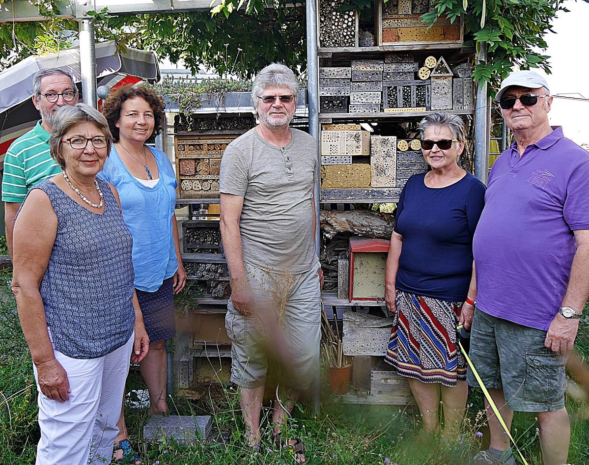 Bildunterschrift: Erwin Scheuchl präsentierte Ruth Müller, MdL (3.v.li.), Cornelia und Joachim Czichon(li) sowie Ursula und Friedrich Egner (re.) sein großzügiges „Wildbienen-Hotel“
