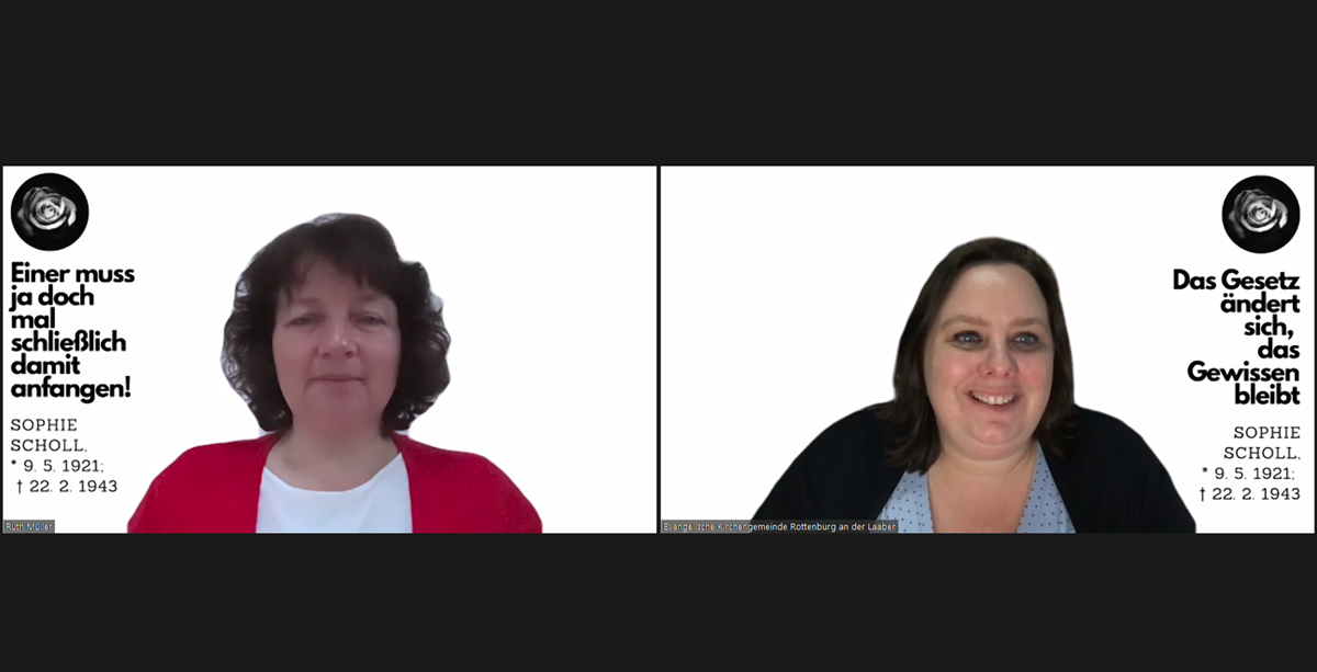 Trotz des - aufgrund der Pandemie – digitalen Formats gelang es den beiden Leserinnen, Sophie Scholls Leben im historischen Kontext und unter Einbeziehung von Erinnerungen der Weggefährten für kurze Zeit wieder lebendig werden zu lassen. „Mit dieser Veranstaltung wollten wir auch einen Beitrag zur Erinnerungskultur in unserem Land leisten und sehen dies als Fortsetzung unserer Aktionen in den letzten Jahren, wie die Bonhoeffer-Wochen, die Ausstellung zu Flucht und Vertreibung und zur Zivilcourage“, so Ruth Müller. Mit dem Lied eines der bekanntesten evangelischen Widerstandskämpfer, dem Theologen Dietrich Bonhoeffer, der einen Monat vor Kriegsende noch im KZ Flossenbürg ermordet wurde, beschlossen die beiden Frauen diese digitale Zeitreise mit einer musikalischen Brücke zu Sophie Scholl und zahlreichen anderen, die ihr Leben und ihre Jugend in diesem sinnlosen Krieg verlieren mussten.