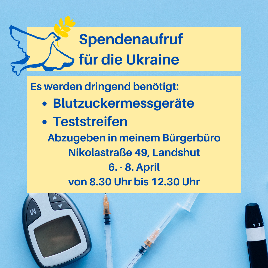 Spenden von ausschließlich diesen beiden Dingen nimmt die Abgeordnete Ruth Müller vom 6.-8. April 2022 von 8.30 Uhr bis 12.30 in ihrem Bürgerbüro in der Nikolastraße 49, 84034 Landshut, entgegen. Diese werden bereits am Montag im Rottal übergeben und dann für den nächsten Transport in die Ukraine verladen.