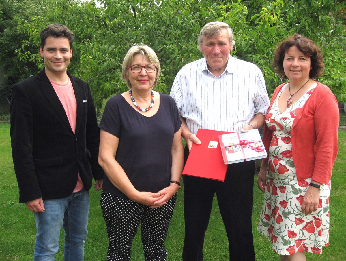 Ergolding. In einer kleinen Feierstunde wurde Johann Fraunberger mit der goldene Ehrennadel nebst Urkunde für 50 Jahre Zugehörigkeit zur SPD von der Ortsvorsitzenden Cornelia Czichon ausgezeichnet. Sie überreichte ein kleines Geschenk und bedankte sich bei Fraunberger für seine ehrenamtliche Tätigkeit in der Partei. So war der Inhaber der silbernen Bürgermedaille für vier Wahlperioden für die SPD im Gemeinderat gesessen. So viel Engagement betrachtet der stellvertretende Ortsvorsitzende Philipp Buchta als Vorbild für seine politische Zukunft. Die SPD Kreisvorsitzende MdL Ruth Müller gratulierte ebenfalls und erinnerte daran, dass Fraunberger während der letzten 50 Jahre drei SPD Bundeskanzler miterlebt hat und gab ihrer Hoffnung Ausdruck, dass im Herbst ein vierter SPD Bundeskanzler dazu kommt.