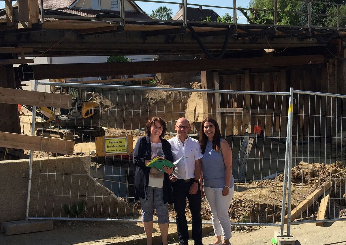 Bildunterschrift: MdL Ruth Müller (li) mit SPD-Kreisfraktionsvorsitzendem Sebastian Hutzenthaler und Kreisrätin Filiz Cetin an der Baustelle der Bahnbrücke in Ergoldsbach