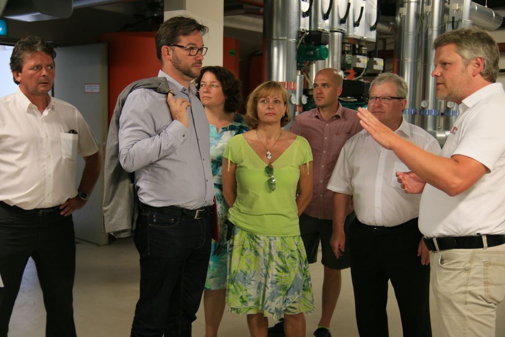 Ein positives Beispiel, wie man die Abwärme bei der Stromerzeugung effektiv nutzt, besichtigten die Besucher im Keller der Ballsporthalle. Dort stehen zwei gasbetriebene Stromaggregate, die immer dann anlaufen, wenn zum Beispiel der Strom aus den regenerativen Quellen nicht so stark fließt. Mit der Abwärme werden mehrere Sporthallen, zwei Schulen, zwei Kindertageseinrichtungen, die Wohnanlage „Alter Bauhof“ und demnächst auch noch das Feuerwehrhaus beheizt. Mit Hilfe von großen Pufferspeichern lässt sich überschüssige Wärme zwischenspeichern, weshalb Stadtwerkechef Schmid von einem Nutzungsgrad um die 90 Prozent ausgeht.