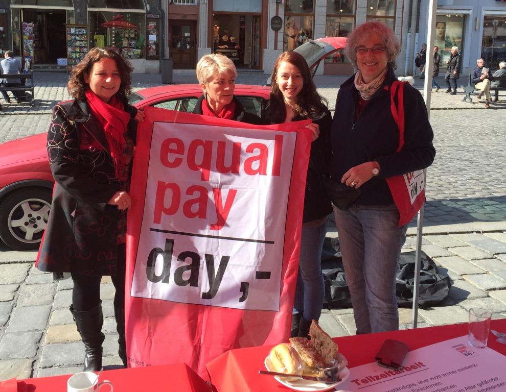 Das Landshuter Frauennetzwerk hat sich mit einem Infostand am 20. März 2015 in der Landshuter Altstadt beteiligt, mit dabei war auch die Landtagsabgeordnete der SPD, Ruth Müller. Die Frauen verteilten rote Taschen und Flyer um auf die Lohnlücke von 23%, die zwischen Frauen und Männern besteht, aufmerksam zu machen.
