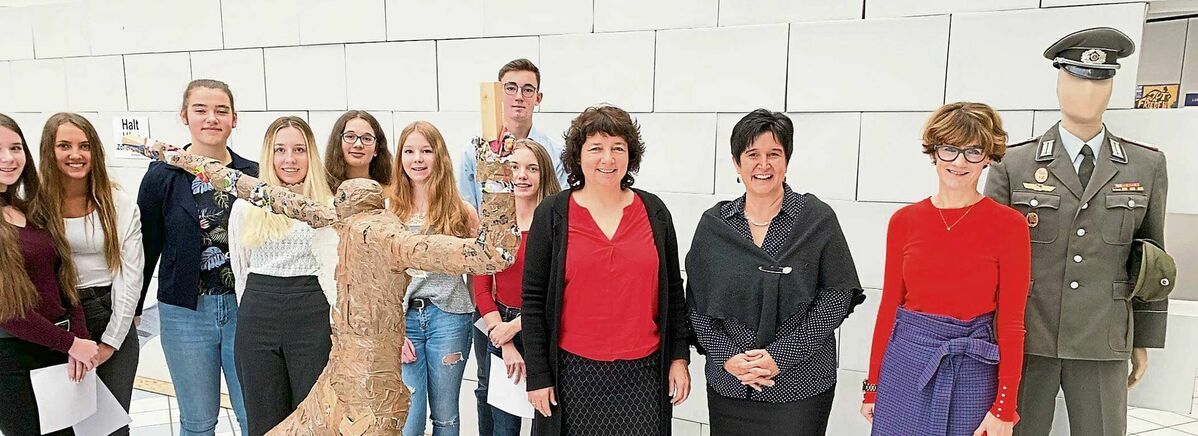 Noichl betonte gegenüber ausgewählten Schülern der zehnten Klassen, sie sei vor allem daran interessiert gewesen, auf konkrete politische Entscheidungen in ihrem Umfeld Einfluss zu nehmen. Dass sie einmal im Europaparlament tätig sein wurde, konnte sie sich als junge Mutter nicht vorstellen. Schon bald sei ihr aber bewusst geworden, wie viel auf europäischer Ebene erreicht werden könne, wenn man Menschen politische Entscheidungen plausibel mache. Für sie sei es wichtig, die in der Politik oft abgehobene Sprache zu vermeiden und nachvollziehbar zu erklären. Zudem müsse man immer wieder verdeutlichen, worum es bei „Europa“ überhaupt geht: Hat die Kommission, der Rat oder das Parlament Entscheidungen getroffen ? Noichl verglich dieses Dreigestirn mit einem Schemel, der auf drei Füßen steht, ohne zu wackeln: So wolle die Europäische Union sein. Die überzeugte Europäerin Noichl bezeichnete Europa als „Versprechen“, die Zukunft friedlich und gedeihlich zu gestalten. Kritisch bewertete sie die Mitgliedsländer Ungarn und Polen, die aktiv gegen Grundideen der Europäischen Union verstießen und denen man deshalb die rote Karte zeigen müsse. Fragen der Schüler betrafen unter anderem eine Frauenquote. Sowohl Ruth Müller als auch Maria Noichl sahen diese ebenso wie etwa einen regionalen Proporz als notwendig an. Es sei wichtig, mit den heutigen Schülerinnen darüber zu diskutieren, da diese zu oft selbstverständlich davon ausgingen, dass sie später einmal die gleichen beruflichen Chancen wie ihre männlichen Mitbewerber haben werden. Abschließend führten Schüler und Ursula Schwoerer die Politikerinnen durch die Ausstellung in der Aula und erklärten ihre ganz besondere Sichtweise.