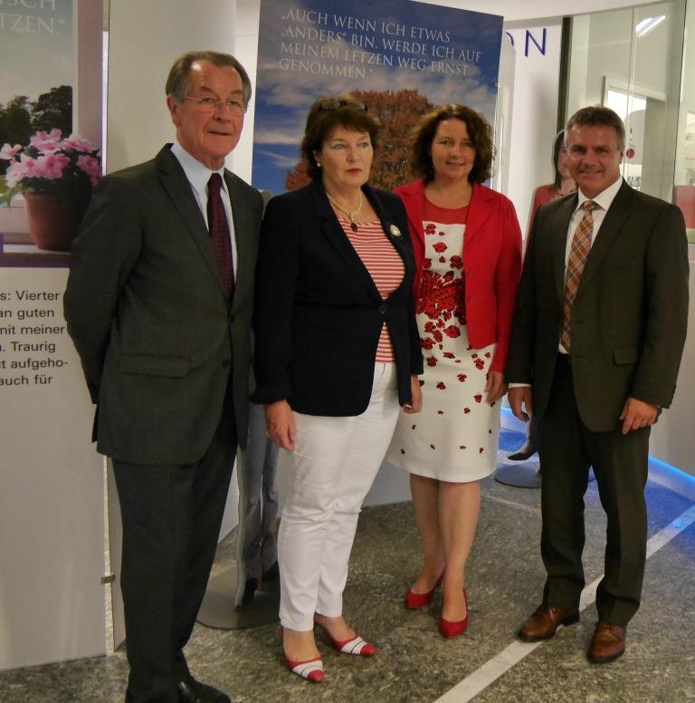 Franz Müntefering, Dr. Marlis Flieser-Hartl, Ruth Müller, Landrat Peter DreierAm Donnerstagabend (09.07.2015) wurde die Ausstellung „Gemeinsam Gehen – Wege der Sterbebegleitung und Versorgung für Schwerstkranke und Angehörige“ im Foyer des Krankenhauses Landshut-Achdorf eröffnet. Die Ausstellung ist der Auftakt für eine Reihe von Veranstaltungen anlässlich des zehnjährigen Bestehens der Palliativstation.