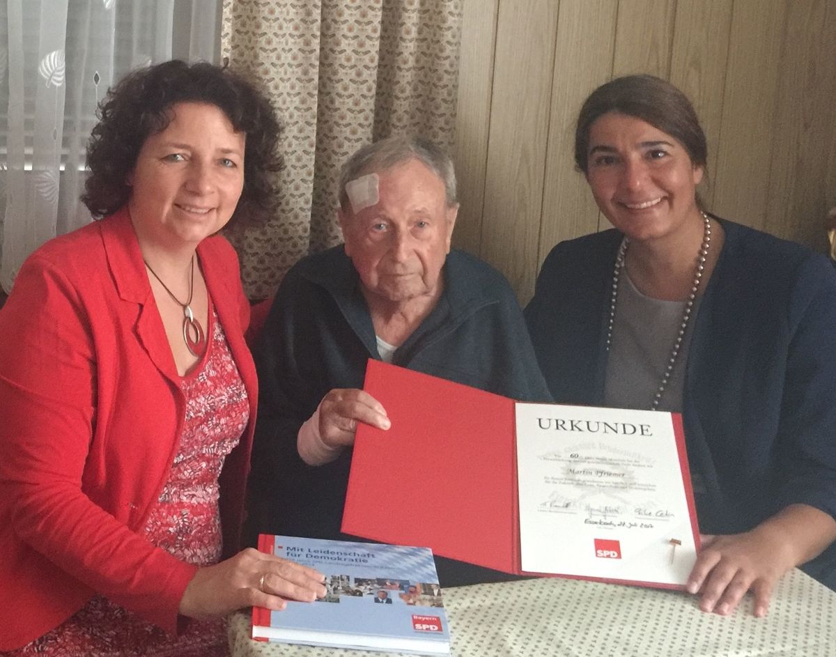 Essenbach. Besondere Gäste konnte Martin Pfriemer am Donnerstag in seinem Haus in der St. Wolfgang-Straße willkommen heißen: Die SPD-Ortsvorsitzende und Kreisrätin Filiz Cetin war gemeinsam mit der Kreisvorsitzenden und Landtagsabgeordneten Ruth Müller zu ihm gekommen, um ihm für seine 60-jährige Mitgliedschaft in der SPD zu danken. Bereits mit 27 Jahren sei Pfriemer in die SPD eingetreten, weil es ihm wichtig war, für die Arbeiter Verbesserungen zu erreichen. Schwierige Diskussionen seien es gewesen, als Anfang der 1970er Jahre die Gebietsreform anstand und aus ehemals eigenständigen Gemeinden die Großgemeinde Essenbach geschaffen wurde, erinnert sich Pfriemer an durchaus hitzige Auseinandersetzungen in der Bürgerschaft. Die Bürger seiner Heimatgemeinde haben Martin Pfriemers Engagement stets zu schätzen gewußt: 31 Jahre – bis zum Jahr 2002 hat er als Gemeinderat an den politischen Entscheidungen mitgewirkt und 18 Jahre sei er Vorsitzender des SPD-Ortsvereins Essenbach gewesen. Glänzende Augen bekam Pfriemer als er über die Wahl von Willy Brandt zum Bundeskanzler erzählte.