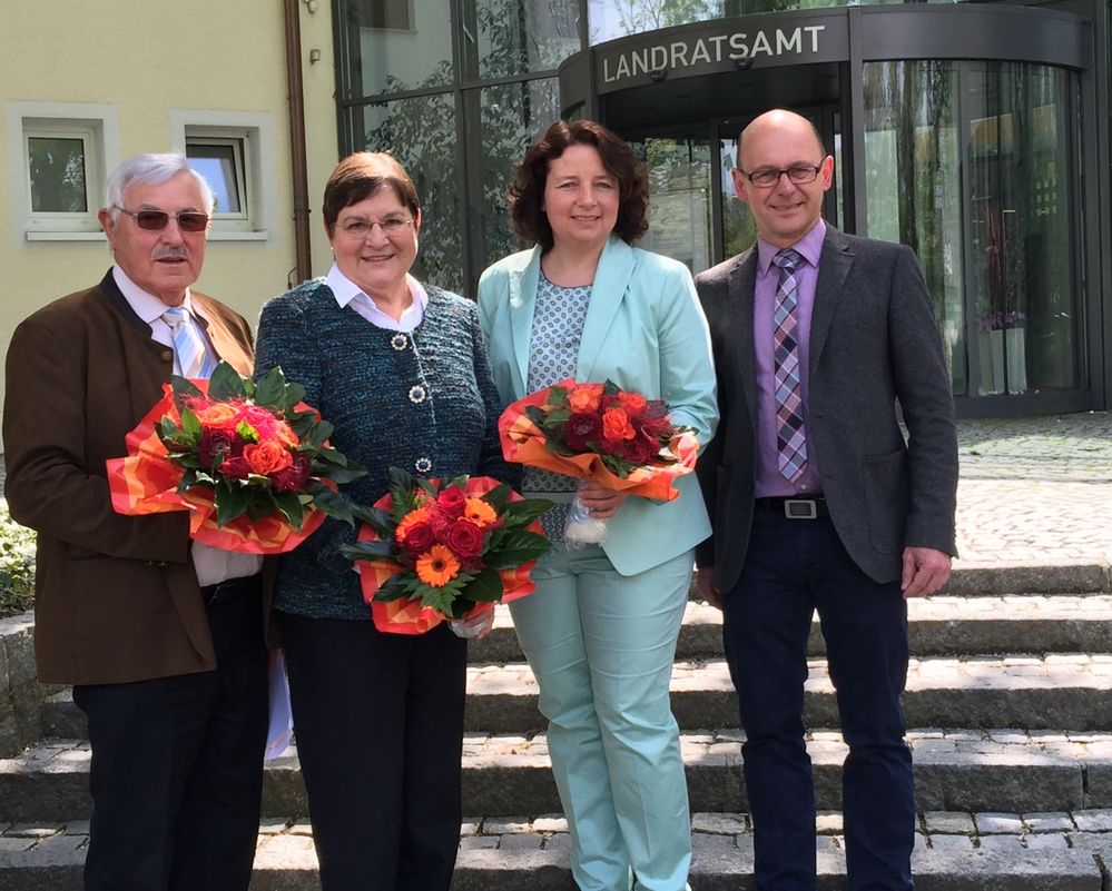 Eine besondere Überraschung hatte der stellvertretende Fraktionsvorsitzende der SPD-Kreistagsfraktion, Sebastian Hutzenthaler für drei Kreistagskollegen am Rande der Fraktionssitzung im Landratsamt parat: Mit einem Blumenstrauß bedankte er sich bei Gerhard Babl (Velden), Christel Engelhard (Altdorf) und Ruth Müller, MdL (Pfeffenhausen) für jeweils zwei Jahrzehnte kommunalpolitischer Tätigkeit im Kreistag von Landshut.