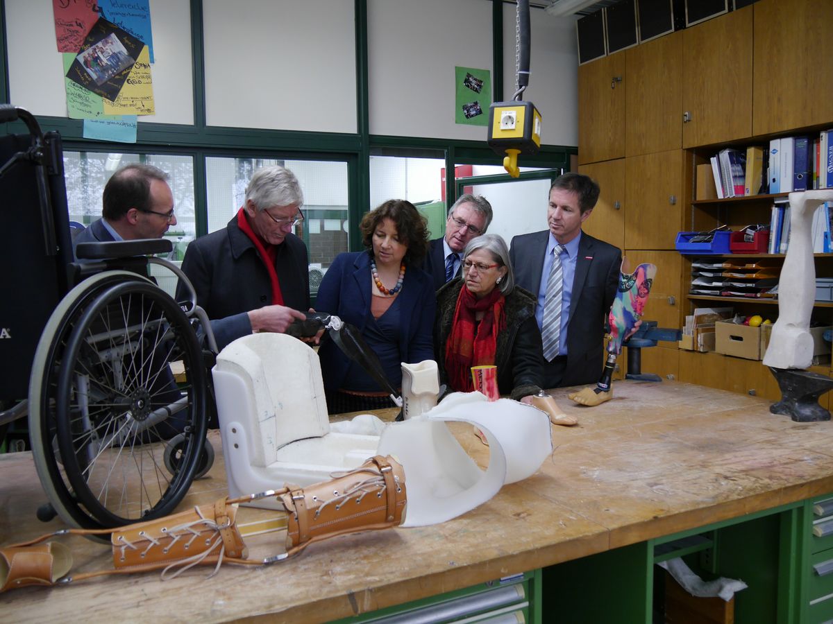 Bei einem Rundgang durch die Werkstätten der überbetrieblichen Ausbildung konnten sich die Abgeordneten ein Bild von der Vielfalt der Qualifizierung machen. Während in der Maurerhalle kunstvolle Rundbögen hochgezogen wurden, arbeiteten die Mechatroniker an verschiedenen Fahrzeugtypen und versuchten Fehlermeldungen zu lokalisieren und zu beheben. Neben den Karosseriebauern und Elektronikern gibt es aber in Landshut als einzigem Standort Ausbildungsstätten für Orthopädieschuhmachermeister und Orthopädietechniker. „Auch das ist ein Beispiel, wie traditionelles Handwerk durch die Digitalisierung verbessert wird“, erläuterte Michael Pigat anhand verschiedener neuer Mess- und Anpasstechniken. „Trotzdem wird die Erfahrung und das Gefühl eines Handwerkers für die persönlichen Anforderungen eines Patienten nicht zu ersetzen sein“, ergänzte Hans Schmidt.