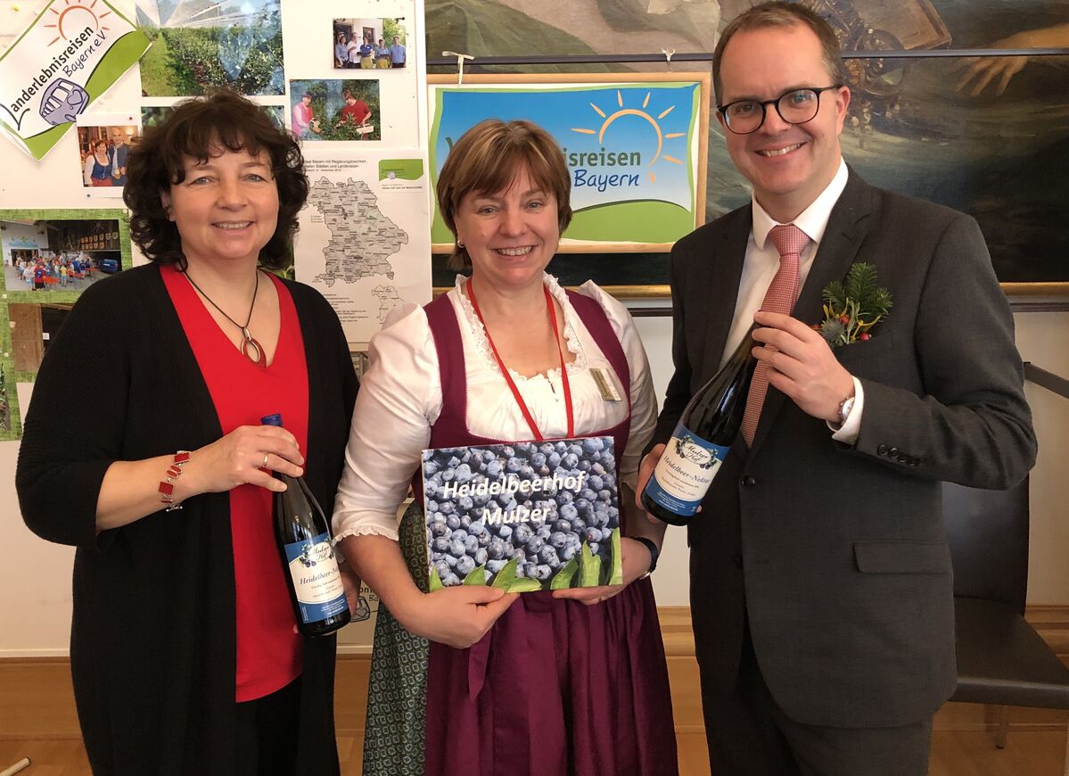 Unter dem Motto „Beerig - Blau - Besonders“ bietet die Hebramsdorferin Rita Mulzer auf ihrem Hof in Naabsiegenhofen im Rahmen der „Landerlebnis-Reisen“ den Besuchern Informationen zur Herstellung, Erzeugung und Verarbeitung von Heidelbeeren. In der Heidelbeer-Saison ist Rita Mulzer auch auf dem Landshuter Wochenmarkt zu finden, auf dem sie ihr heimisches „Super-Food“ anbietet. Die Hauswirtschaftsmeisterin hat sich vor einigen Jahren entschlossen, ihren Betrieb für Besuchergruppen zu öffnen, um den Kontakt zwischen Erzeugern und Verbrauchern zu verbessern. „Alleine in diesem Jahr waren 40 Busse auf unserem Hof zu Gast und haben beerige Kuchen oder deftige Brotzeiten aus der Hofküche verkostet“, erläuterte Mulzer im Rahmen des Ausstellungstags im Bayerischen Landtag. Die agrarpolitische Sprecherin der BayernSPD-Landtagsfraktion Ruth Müller, MdL freute sich, eine ehemalige Landjugend-Kollegin aus dem Landkreis Landshut wiederzutreffen. Müller, die im Agrarausschuss für den Bereich der Direktvermarktung zuständig ist, informierte sich am Stand von Rita Mulzer zusammen mit dem Vizepräsidenten des Bayerischen Landtags, Markus Rinderspacher, MdL. „Unsere Direktvermarkter sind die besten Botschafter für unsere bayerischen Lebensmittel“, so Müller.