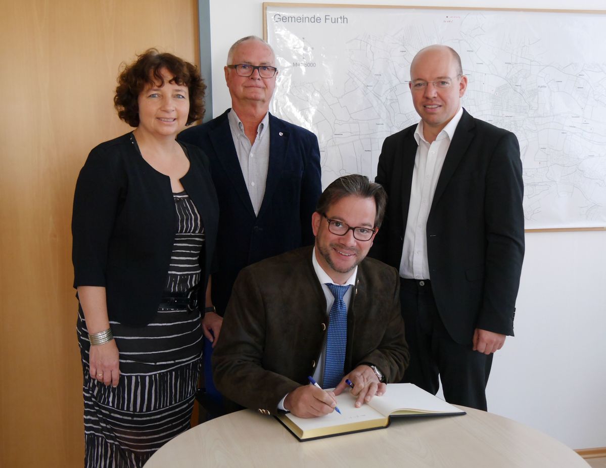 Kürzlich stattete der parlamentarische Staatssekretär im Ministerium für Umwelt, Naturschutz, Bau- und Reaktorsicherheit, Florian Pronold (vorne), gemeinsam mit der Landshuter Landtagsabgeordneten Ruth Müller (li.), der Gemeinde Furth einen Besuch ab. Aus diesem Anlass informierte Bürgermeister Andreas Horsche (re.) gemeinsam mit Gemeinderat Hans-Peter Scherble, den Experten für Bau- und Stadtentwicklung im Bundesumweltministerium, über die aktuelle Umgestaltung des Klosterkomplexes zu einem Bildungszentrum. Gerne kam der Bundestagsabgeordnete dabei der Bitte nach, einen Eintrag ins Goldene Buch der Gemeinde anzufertigen. Bei einem kurzen Rundgang zeigte Andreas Horsche seinen Gästen das neue Ortszentrum – ein Vorzeigebeispiel für gelungene städtebauliche Innenentwicklung.