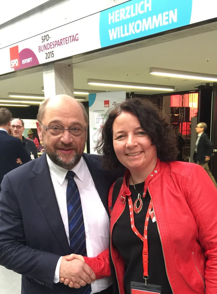 Er kritisierte die unsolidarische Haltung einiger anderer europäischer Länder hinsichtlich der Aufnahme geflüchteter Menschen. Dennoch stelle die Aufnahme, Unterbringung und Versorgung eine große Herausforderung für alle Verantwortlichen dar. Die Sozialdemokraten wollen deshalb dafür sorgen, dass die Unterbringungsmöglichkeiten und Wohnkapazitäten ausreichen und Sprach- und Integrationskurse angeboten werden. Für eine langfristige Integration sei aber auch der Zugang zum Arbeitsmarkt ein wichtiger Schlüssel zum Erfolg. Im Anschluss an seine Rede hatte die Pfeffenhausener Landtagsabgeordnete Ruth Müller, die als Delegierte auf dem Bundesparteitag dabei war, die Gelegenheit mit Martin Schulz zu sprechen. "Wir stehen vor einer historischen Aufgabe", so Müller. Es müssten die Verfahren beschleunigt werden und die Ehrenamtlichen entlastet werden. Zudem sei es wichtig, die staatlichen Systeme und Hilfeleistungen aufeinander abzustimmen. "Leute, die Flüchtlingsheime anzünden, seien keine Patrioten sondern eine Schande für Deutschland", fand Schulz deutliche Worte für die Brandstifter.