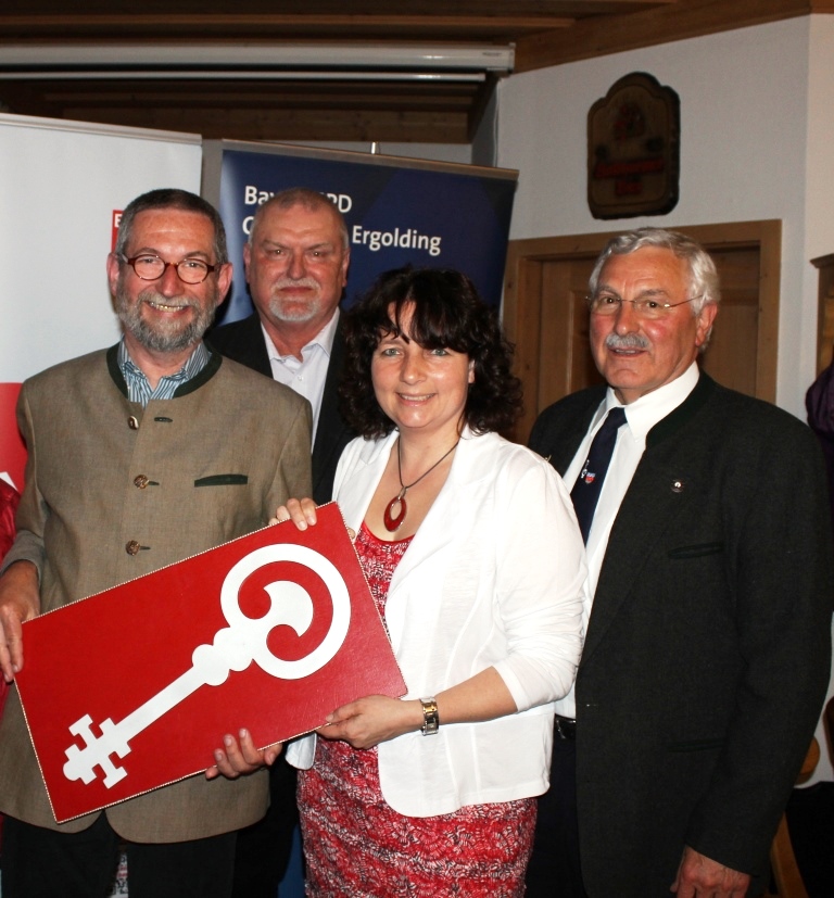 Kreis- und Fraktionsvorsitzende Ruth Müller überreicht symbolisch den Rathausschlüssel und wünscht dem SPD-Kandidaten viel Erfolg