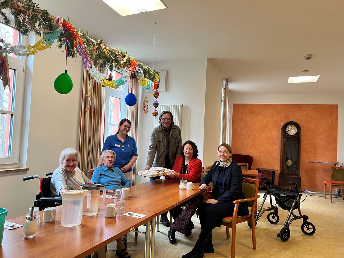 Gerzen. Eine besondere Überraschung hatte Bürgermeister Hans Luger am Rosenmontag für die Beschäftigten und Bewohner im Seniorenpark Schloss Gerzen parat: Zusammen mit der Landratskandidatin Ruth Müller und Kreisrätin Sibylle Entwistle besuchte er wieder einmal das Seniorenheim und hatte passend zum Faschingsendspurt Krapfen dabei. Pflegerin Ashley Cassada und ihre Kolleginnen freuten sich über den Besuch und die damit verbundene Wertschätzung ihrer Arbeit. Seit Corona besuchen die SPD-Mitglieder im Landkreis Landshut immer wieder Seniorenheime in der Faschingszeit, um auch den Mitarbeitenden in der Pflege zu danken. „Denn Klatschen alleine reicht nicht“, formulierte es Ruth Müller beim Termin vor Ort.