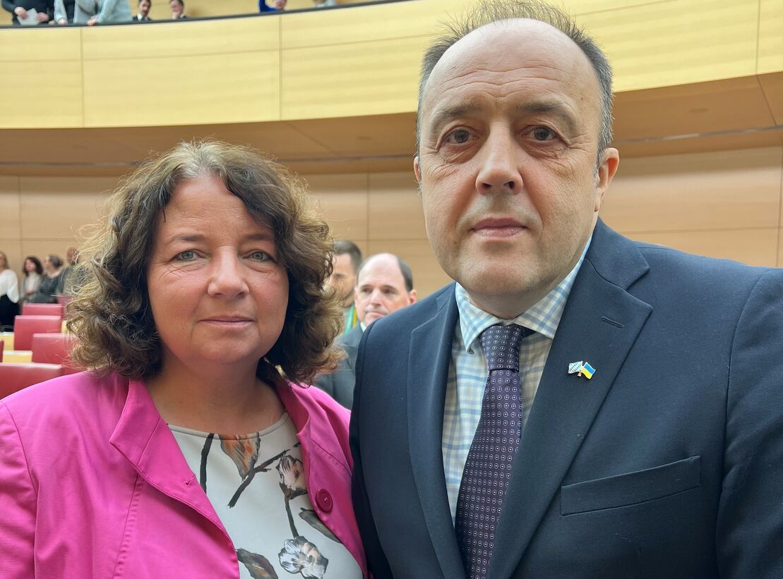 Ruth Müller, MdL (SPD), tauschte sich bei Gedenkakt im Landtag zu 80 Jahren Flucht und Vertreibung mit ukrainischem Generalkonsul aus
