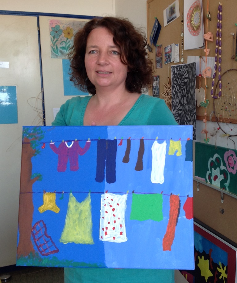 "Gegenüber" heißt die Aktion, die dazu anregen soll, auf das Vorhandene zu antworten, es fortzuführen und damit weiterzuarbeiten. Ich habe mich dazu entschlossen, die "Wäsche fertig aufzuhängen" - die erste Hälfte des Bildes fand ich so fröhlich, dass ich dieses Bild beendet habe. Ungewohnt war es allemal, sich Zeit zu nehmen um zu malen. Aber es hat Spaß gemacht!