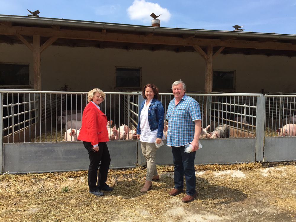 Hans Hohenester führte die Politikerinnen über den Hof und erklärte, dass dieser im Jahr 1990 auf ökologische Landwirtschaft umgestellt wurde und nach den Naturland-Richtlinien arbeite. Der Gedanke der Umstellung kam dadurch, dass auch seine Kinder eine langfristige Zukunft haben sollten und deshalb eine nachhaltige Bewirtschaftung unerlässlich ist. Der Schwerpunkt des Betriebes liegt auf der Schweinemast. Weitere Standbeine sind der Ackerbau und die Forstwirtschaft. Bei der Schweinemast ist die artgerechte Haltung das A und O. Gewährleistet wird diese durch genug Platz zur Bewegung in Form eines eingestreuten, überdachten Auslaufs. Die Schweine wachsen gesund auf. Sie erhalten rein pflanzliches Futter aus dem eigenen Betrieb und von benachbarten Naturland-Betrieben. Auf die Frage der Wirtschaftlichkeit seitens der Abgeordneten bestätigte Hans Hohenester, dass es einen großen Absatzmarkt für Bioschweine gäbe und sich ein höherer Preis durch die aufwendigere Haltung der Tiere rechtfertigen lasse. Der Verbraucher sei auch bereit, für artgerecht gehaltene Schweine einen höheren Preis zu bezahlen. Die Landtagsabgeordnete Ruth Müller berichtete über die Aktivitäten der SPD-Landtagsfraktion, um den Ökolandbau zu unterstützen. So habe man beispielsweise eine verstärkte Förderung von Umweltleistungen beantragt die dann beispielsweise für freiwillige Leistungen im Tierwohl, Gewässerschutzprogramme oder Heckenpflege verwendet werden könnten.