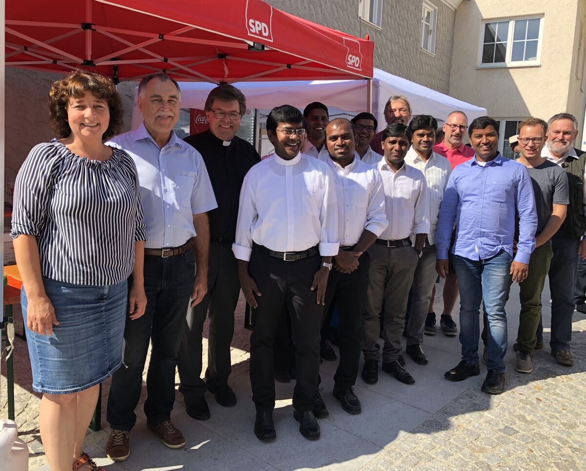 Organisatoren des SPD-Festes mit Besuchern um Pfarrer Günter Müller