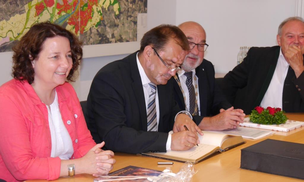 Bei seinem Eintrag ins Goldene Buch der Stadt Landshut lobte Vogelsänger die vorbildliche Sanierung der Landshuter Altstadt und deutete auch die positive Einwohnerentwicklung als Beleg für die Anziehungskraft dieser schönen Stadt. Mit einem Buchskranzl und einem Buch über die „Landshuter Hochzeit“ bedankte sich 3. Bürgermeister Erwin Schneck für den Besuch des Ministers aus dem fernen Brandenburg.