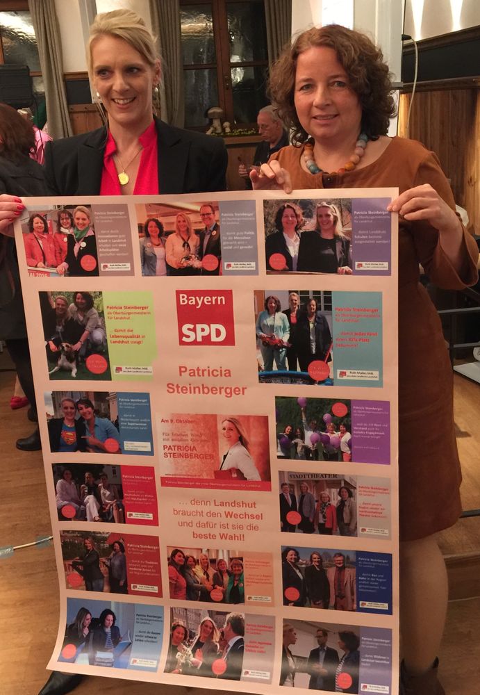 Die SPD-Kreisvorsitzende Ruth Müller, MdL hatte zum Wahlabschluss ein Plakat für Patricia Steinberger als Geschenk parat: "Bei den vielen Terminen, die wir gemeinsam durchgeführt haben, sind zahlreiche Fotos entstanden, die ich mit Deinen Plänen für Landshut vertextet habe". Und die Oberbürgermeisterkandidatin habe somit ein weiteres Wahlkplakat für den Endspurt ihres Wahlkampfes mit vielen guten Gründen, um sie zu wählen.