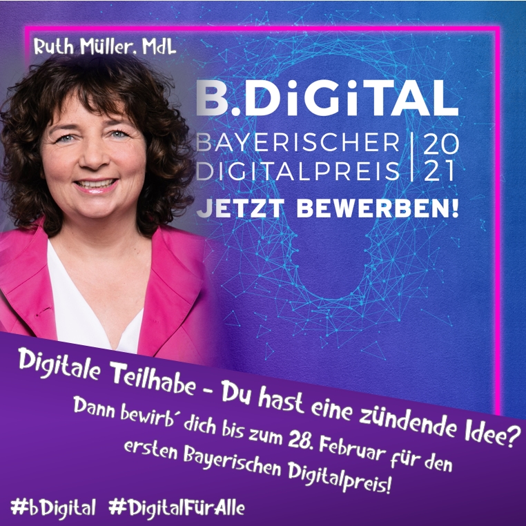 Die aktuelle Pandemie hat die Digitalisierung in sämtlichen Bereichen erheblich beschleunigt. Dass es jedoch trotz der rasanten Entwicklung im vergangenen Jahr noch zahlreiche „Baustellen“ gibt, hat die Corona-Krise schonungslos zum Vorschein gebracht. Unter dem Motto „digitale Teilhabe“ zeichnet das Bayerische Staatsministerium für Digitales daher in diesem Jahr erstmalig Projekte aus, die sich schwerpunktmäßig mit der Integration von Gruppen in die digitale Welt beschäftigen, die aktuell noch durchs Raster fallen. „Gerade die ältere Generation, sowie Menschen mit Behinderung müssen stärker in die Digitalisierung mit eingebunden werden, da diese zu einem wichtigen sozialen Faktor geworden ist und der gesellschaftliche Zusammenhalt in Zeiten von Social Distancing so erhalten bleiben kann“, erklärt Ruth Müller die Bedeutung von Projekten, die die digitale Teilhabe im Fokus haben.