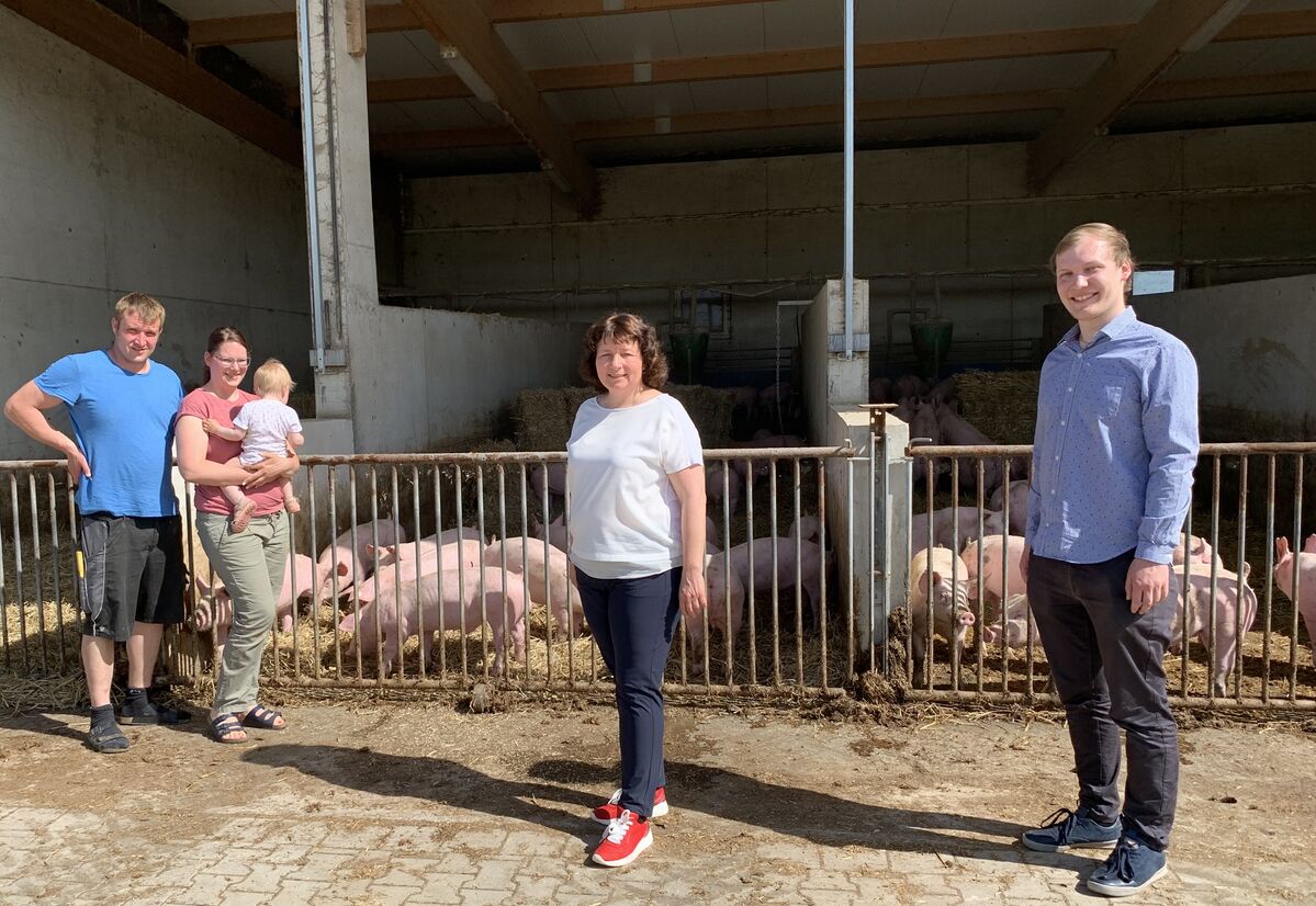 „Die Nachfrage nach regionalen Produkten ist im letzten Jahr sehr gestiegen“, machte Paul Heckinger, Seniorchef des landwirtschaftlichen Betriebs in Essenbach beim Gespräch mit der agrarpolitischen Sprecherin der BayernSPD-Landtagsfraktion, Ruth Müller, MdL deutlich. Im Rahmen der Aktion des Bayerischen Bauernverbands „Frühstück auf dem Bauernhof“ hatte er zusammen mit seiner Tochter und Hofnachfolgerin Regina sowie deren Ehemann Robert Härtinger die Landtagsabgeordnete und den Bundestagskandidaten Vincent Hogenkamp eingeladen – zwar pandemiebedingt nicht zum Frühstück, sondern zu einem Gespräch zwischen Schweinestall und Schafherde. Als Direktvermarkter waren wir auch nicht vom „Schweinestau“ betroffen, denn unsere Schweine sind nicht für den Weltmarkt bestimmt, sondern werden in der hauseigenen Metzgerei verarbeitet und im Hofladen „Fannerls Bauernladen“ in Essenbach, auf den Bauernmärkten in Eching beim Möbelhaus Biller, im Seehaus im Englischen Garten und am Rathausplatz in Garching bei München verkauft. Doch auch für ihr hausgemachtes Brot ist Familie Heckinger/Härtinger bekannt, welches im über 100 Jahre alten Holzofen gebacken wird.