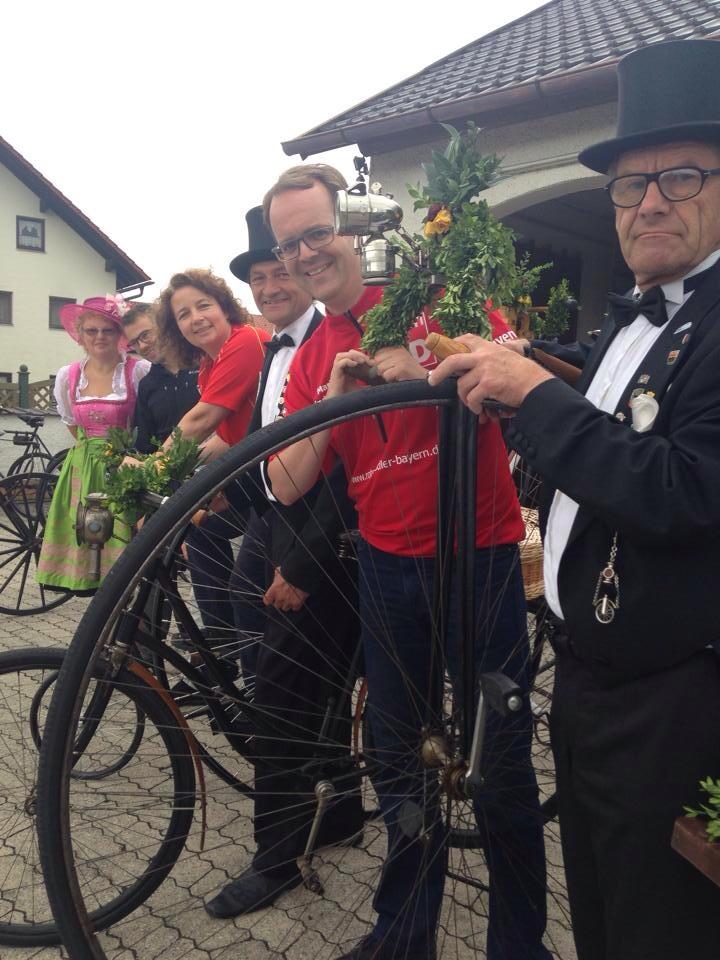 Matthias Schmid von den „Historischen Rädern Bruckberg“ hatte sein großes Repertoire an Lauf- und Hochrädern und Rikschas aufgebaut, um die Delegation der Sozialdemokraten über die Geschichte des Radfahrens zu informieren. Natürlich ließen es sich die beiden Landtagsabgeordneten Markus Rinderspacher und Ruth Müller nicht nehmen, und probierten das Hochradfahren selbst aus, dass doch eine ganz andere Technik und Geschicklichkeit erfordert. Mit dabei war auch der amtierende Weltmeister im Hochradfahren Hans Rüger, der die „Roten Radler“ mit seinem Hochzeitsrad bis Dingolfing begleitete.