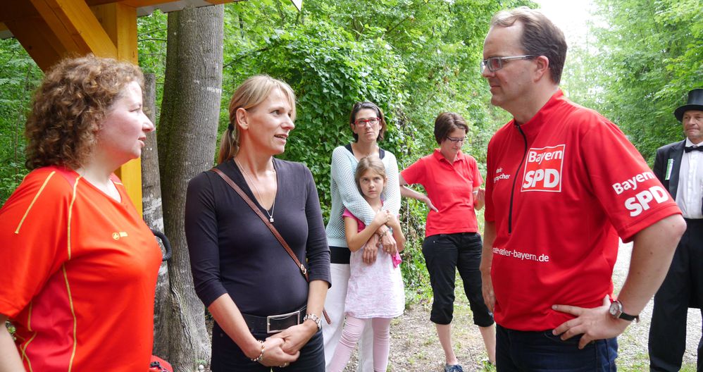 Der SPD-Ortsverein hatte eine Brotzeit und Erfrischungen vorbereitet und so trafen die Radler, die am Vormittag in Bruckberg gestartet waren, gemeinsam mit den SPD-Gemeinderätinnen Filiz Cetin und Kerstin Schanzer aus den Nachbargemeinden Essenbach und Niederaichbach an der idyllisch gelegenen Anlage am Isarradweg ein. Die stellvertretende Ortsvorsitzende Monika Stadler begrüßte zusammen mit Gitte Reiseck in Vertretung des Vorsitzenden Armin Reiseck die Radler, da dieser gemeinsam mit Bürgermeister Stefan Scheibenzuber kurzfristig einen anderen Termin wahrnehmen musste. Energiepolitik, die Schule am Ort und der DSL-Ausbau waren kommunalpolitische Themen, die die „Roten Radler“ an der Wörther Kneippanlage miteinander diskutierten, bevor es zum nächsten Streckenabschnitt in den Landkreis Dingolfing weiterging.