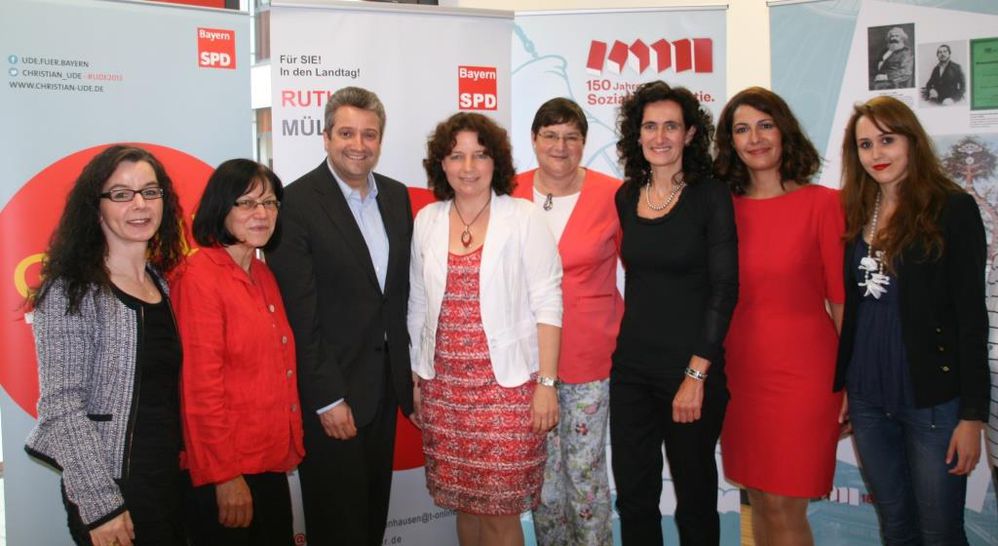 MdL Dr. Thomas Beyer (3. v. l.) mit engagierten Sozialdemokratinnen: Anja König (Stadtverbandsvorsitzende); MdL Johanna Werner-Muggendorfer (stv. AWO-Bezirksvorsitzende); Ruth Müller (Kreis- und Fraktionsvorsitzende); Christel Engelhard (stv. Landrätin); Angelika Thiel, Filiz Cetin und Marcella Isleb (Teilnehmerinnen des SoFIA-Projekts)