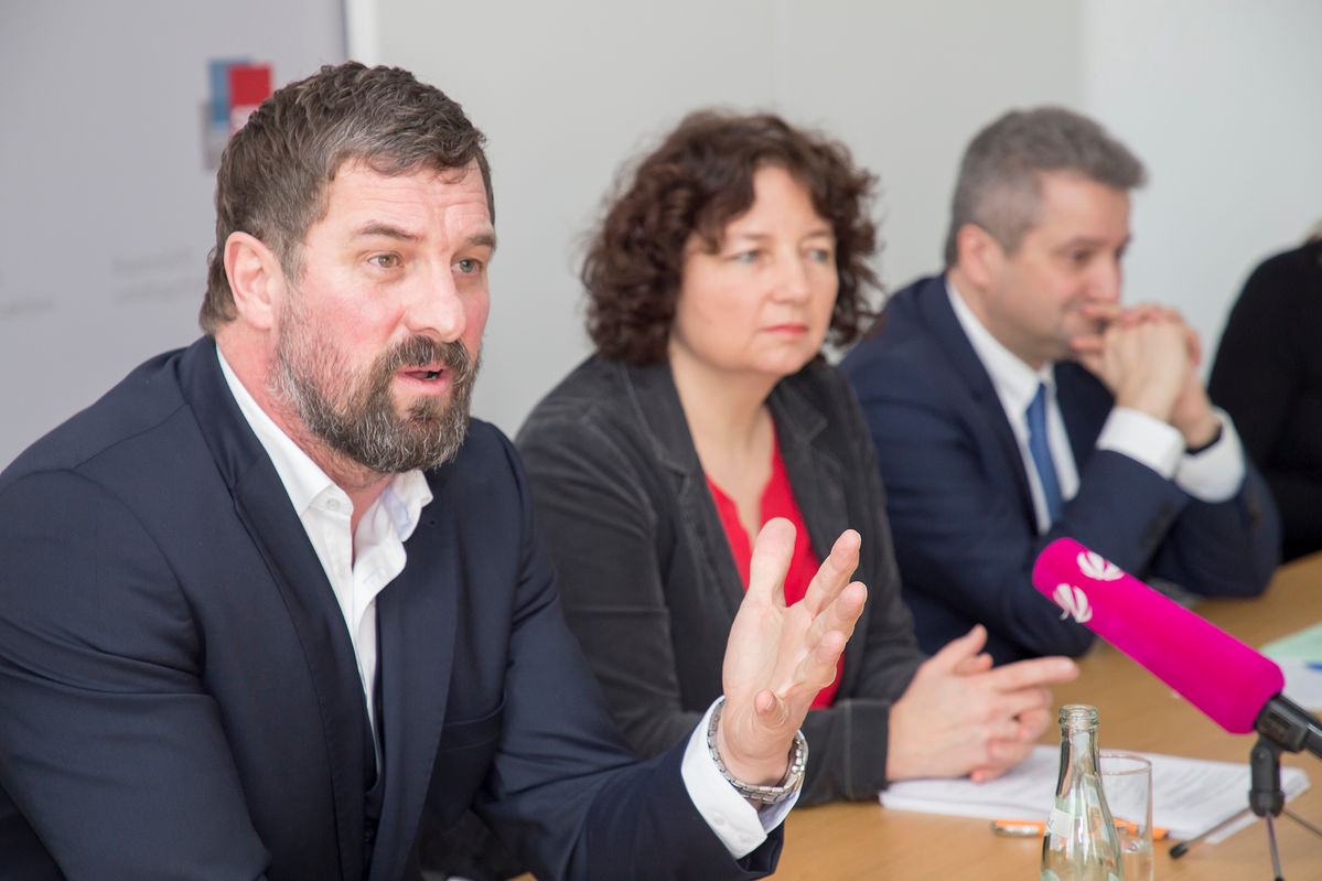 Bildunterschrift: Professor Christian Janßen von der Hochschule für angewandte Wissenschaften München, Gesundheitspolitikerin Ruth Müller, Landshut und der Vorsitzende der Arbeiterwohlfahrt Bayern, Prof. Dr. Thomas Beyer bei der Pressekonferenz im Bayerischen Landtag. Foto Jansen