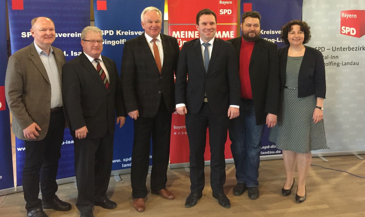 Für den Bezirkstag geht für die SPD Udo Egleder an den Start. „Der Kreisrat, BLSV-Bezirksvorsitzender und Vorsitzende der Lebenshilfe Dingolfing-Landau bringt aufgrund seiner umfangreichen Vorkenntnisse die besten Voraussetzungen mit“, wurde für den Kandidaten geworben. Egleder ist in Wart geboren und im Vilstal aufgewachsen, seine Tätigkeit als Lehrer führte ihn weit umher, so dass er den Wahlkreis gut kenne, wie er hervorhob. Mittlerweile ist er verstärkt im ehrenamtlichen Bereich tätig und will diese Arbeit auf die politische Ebene übertragen. „Die Steigerung der Lebensqualität von der ärztlichen Versorgung bis hin zur kulturellen Entwicklung und der Stärkung des ländlichen Raumes – dafür stehe ich.“ Der Platz des Listenkandidaten für den Bezirkstag wird von Hans Sarcher aus Vilsbiburg belegt. Er ist Zweiter Bürgermeister der Stadt Vilsbiburg und Landshuter Kreisrat. Hans Sarcher wurde in Vilsbiburg geboren, ist verheiratet und hat zwei Kinder. Nach seiner Lehrzeit im Fernmeldeamt war er bis zur Pensionierung in diesem Bereich tätig. „Die Aufgaben des Bezirks sind vielseitig, Niederbayern ist ein großes Gebiet mit verschiedenen Strukturen“, wie er bei seiner Vorstellung unterstrich. Er möchte sich dieser Aufgabe stellen und verlässlicher Ansprechpartner sein, versprach er. Gemeinsam wolle man mit voller Kraft zum Wohle der Bürger arbeiten, Familienfreundlichkeit, Bürgerfreundlichkeit und die Schaffung optimaler Verhältnisse seien dabei groß geschrieben, waren sich die Kandidaten abschließend einig.