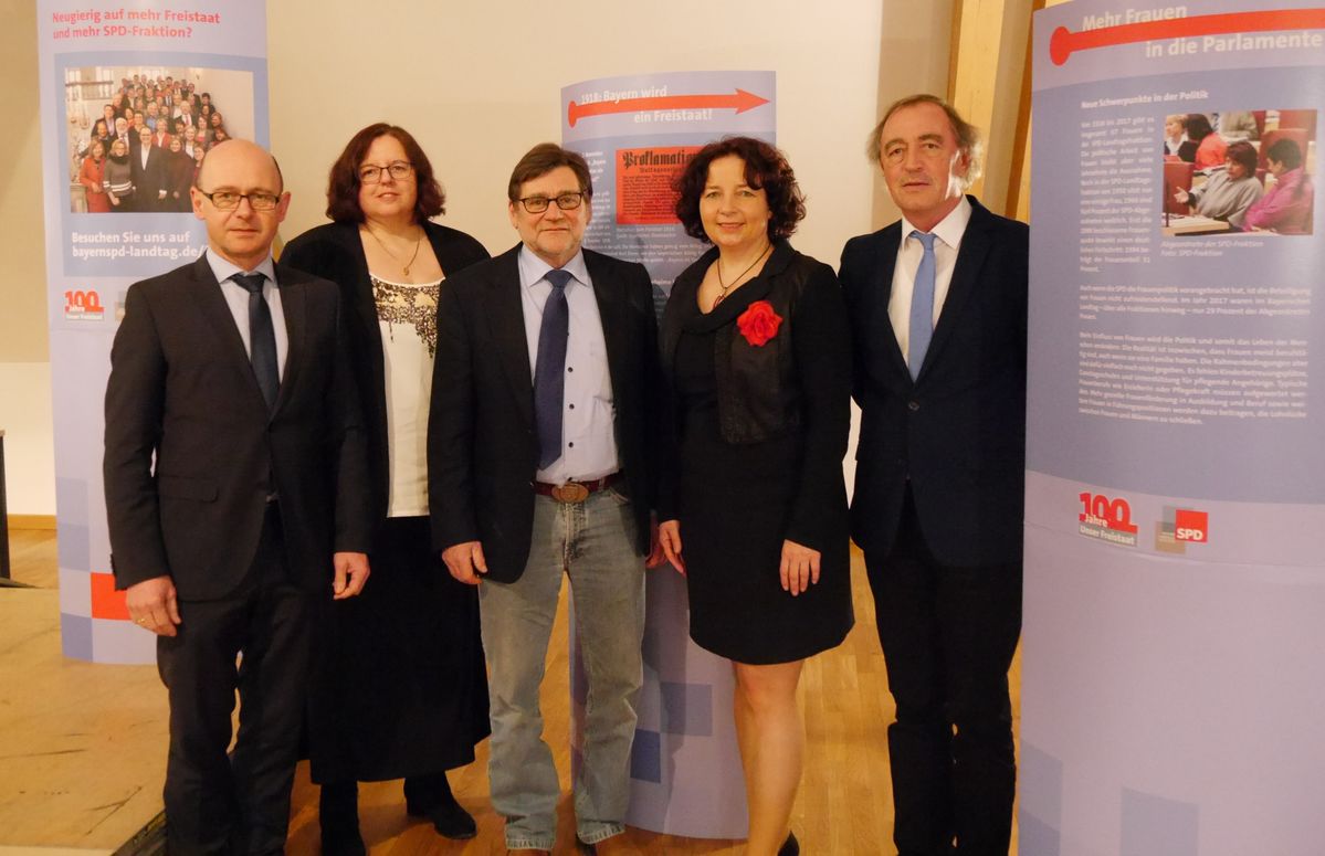 In ihrer Begrüßung erinnerte Müller an besondere Meilensteine in der Geschichte des Freistaats, die eng mit der Sozialdemokratie verknüpft sind: Am 7. November 1918 rief der Sozialdemokrat Kurt Eisner in einer unblutigen Revolution in München den Freistaat aus. Im Aufruf „An die Bevölkerung Münchens“ hieß es: „Bayern ist fortan ein Freistaat“ – und damit wurde erstmals auf deutschem Boden das bis heute gültige, „allgemeine, direkte und geheime Wahlrecht“ eingeführt. Bei der ersten Landtagswahl im Januar 1919 durften erstmals auch Frauen wählen, denn Eisner gab den Frauen auch das Stimmrecht. In den 100 Tagen der Regierung unter Kurt Eisner wurde der Acht-Stunden-Tag eingeführt, ein Sozialminister berufen, der sich der zunehmenden Ungleichheit annehmen sollte und ein Wohnungsbauprogramm aufgelegt, um die größte Wohnungsnot nach dem 1. Weltkrieg zu beheben.