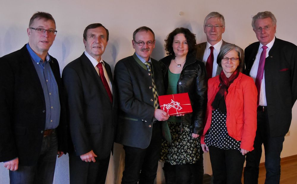 Enquete-Kommission bei Bürgermeister Georg SteinhoferDie SPD-MdL Dr. Christoph Rabenstein (2. v.l.), Ruth Müller (Mitte), Günther Knoblauch (r.), Johanna Werner-Muggendorfer und Bernhard Roos (3. v.r.) überreichten Bürgermeister Georg Steinhofer (3. v.l.) und Mitarbeiter Robert Sageder einen Erhard-Auer-Gedenkstein