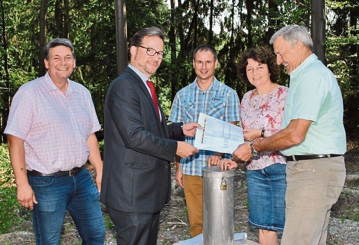 Bildunterschrift: Bürgermeister Peter Forstner, Bundestagsabgeordneter Florian Pronold, Technischer Betriebsleiter Mirko Wand, Landtagsabgeordnete Ruth Müller und Zweckverbandsvorsitzender Hans Weinzierl am zukünftigen Trinkwasserbrunnen in Einkreut.